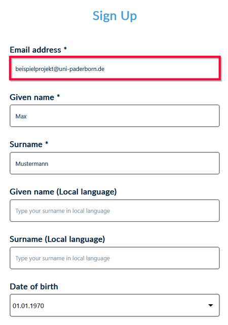 - Name (Local language): Falls Ihr Name Umlaute enthält, können Sie in hier erneute in der korrekten Schreibweise mit Umlauten eintragen (Optional).