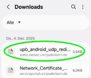 | 07:58, 19. Dez. 2025 | Eduroam-android-05.png (Datei) | 135 KB | Jnk | {{Information | description = Screenshot Android - HARICA CA Zertifikat als .pem installieren - Download direkt bei HARICA | source = Screenshot | date = 19.12.2025 | author = Benutzer:jnk | permission = {{PD-user|jnk}} }}Kategorie:Screenshots | 1 | |