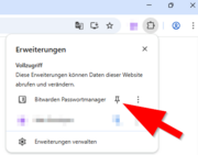| 11:24, 4. Mär. 2026 | Bitwarden-19.png (Datei) | 103 KB | Jnk | {{Information | description = Screenshot Bitwarden - Browsererweiterung Installieren | source = Screenshot | date = 04.03.2026 | author = Benutzer:jnk | permission = {{PD-user|jnk}} }}Kategorie:Screenshots | 1 | |