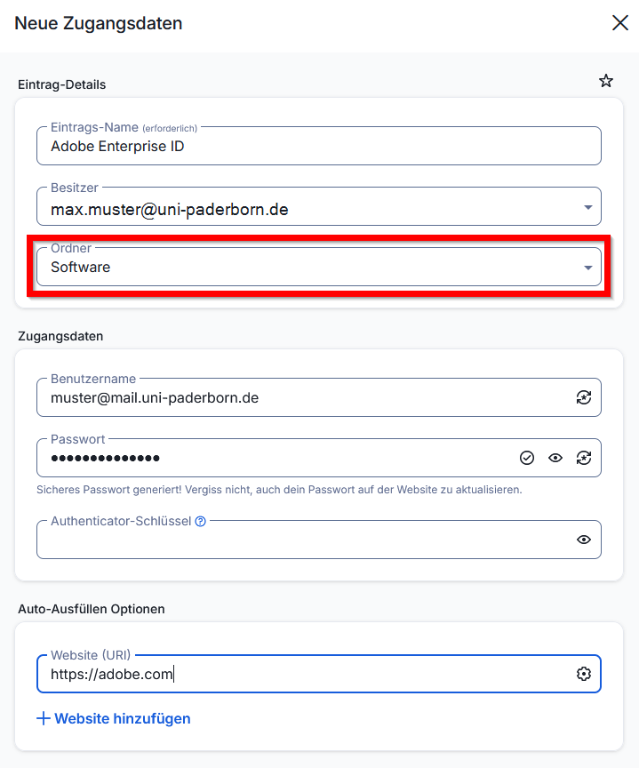 In diesem Beispiel erstellen wir einen Eintrag für die Zugangsdaten zum Uni-Account.