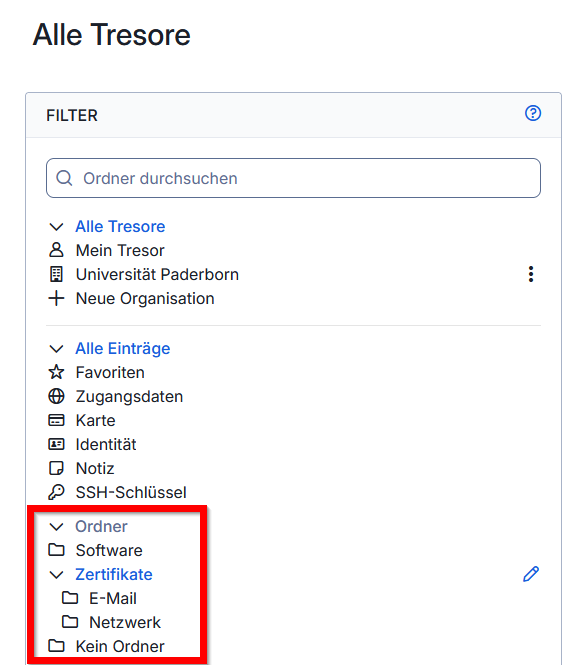 | + | * Die Ordnerstruktur können Sie in der Tresor-Übersicht am linken Rand sehen. | ||