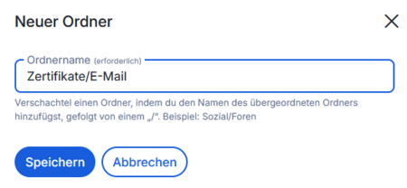 | + | * Indem wir <code>Zertifikate/E-Mail</code> als Ordnername eingeben, erstellen wir einen neuen Ordner '''"E-Mail"''' als Unterordner von '''"Zertifikate"'''. | ||