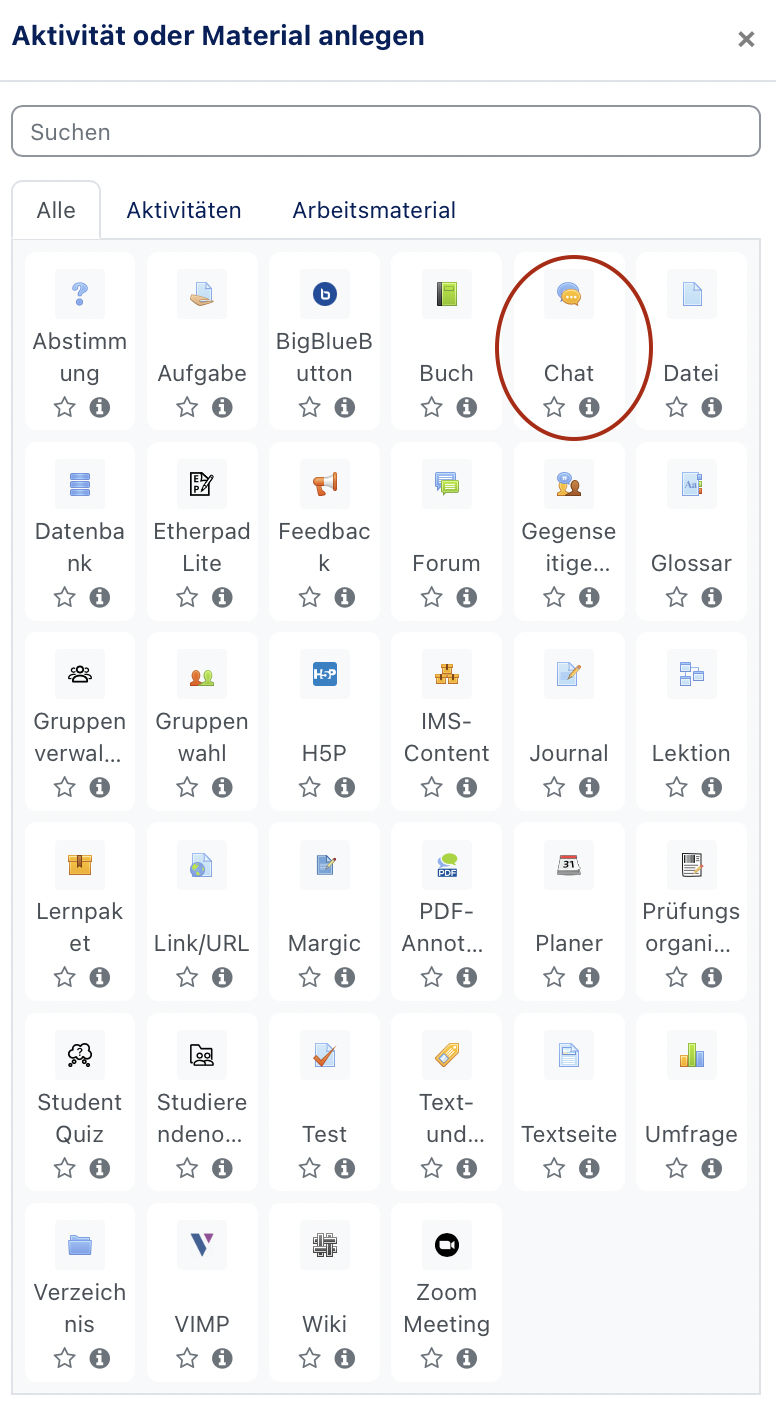 | aktuell | 08:19, 23. Jul. 2025 | 782 × 848 (86 KB) | Mfunk (Diskussion | Beiträge) | {{Information | description = Screenshot Moodle Chat anlegen | source = Screenshot | date = 23.07.2025 | author = Benutzer:mfunk | permission = {{PD-user|mfunk}} }}Kategorie:Screenshots | |