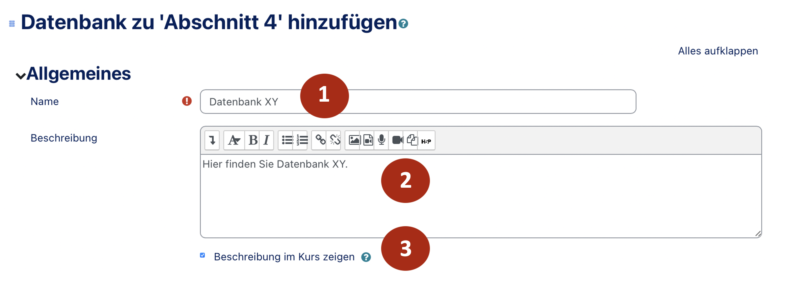 | aktuell | 12:14, 23. Jul. 2025 | 957 × 466 (31 KB) | Mfunk (Diskussion | Beiträge) | {{Information | description = Screenshot Moodle Datenbank Grundeinträge | source = Screenshot | date = 23.07.2025 | author = Benutzer:mfunk | permission = {{PD-user|mfunk}} }}Kategorie:Screenshots | |