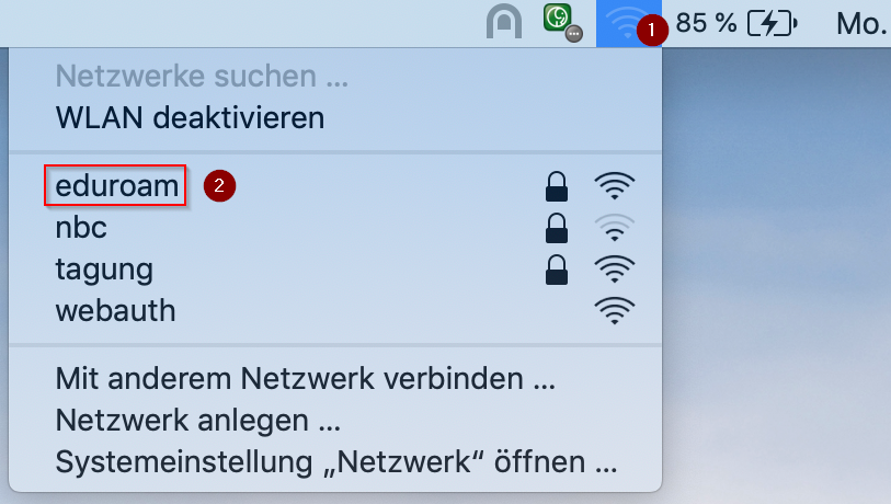 | Description | Screenshot aus MacOS Mojave - WLAN Dropdown Menü für Eduroam |