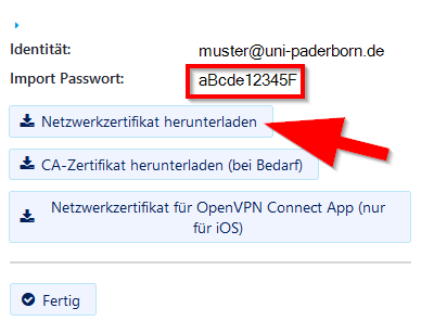| Description | Screenshot Serviceportal - Import-Passwort kopieren und Netzwerkzertifikat herunterladen |